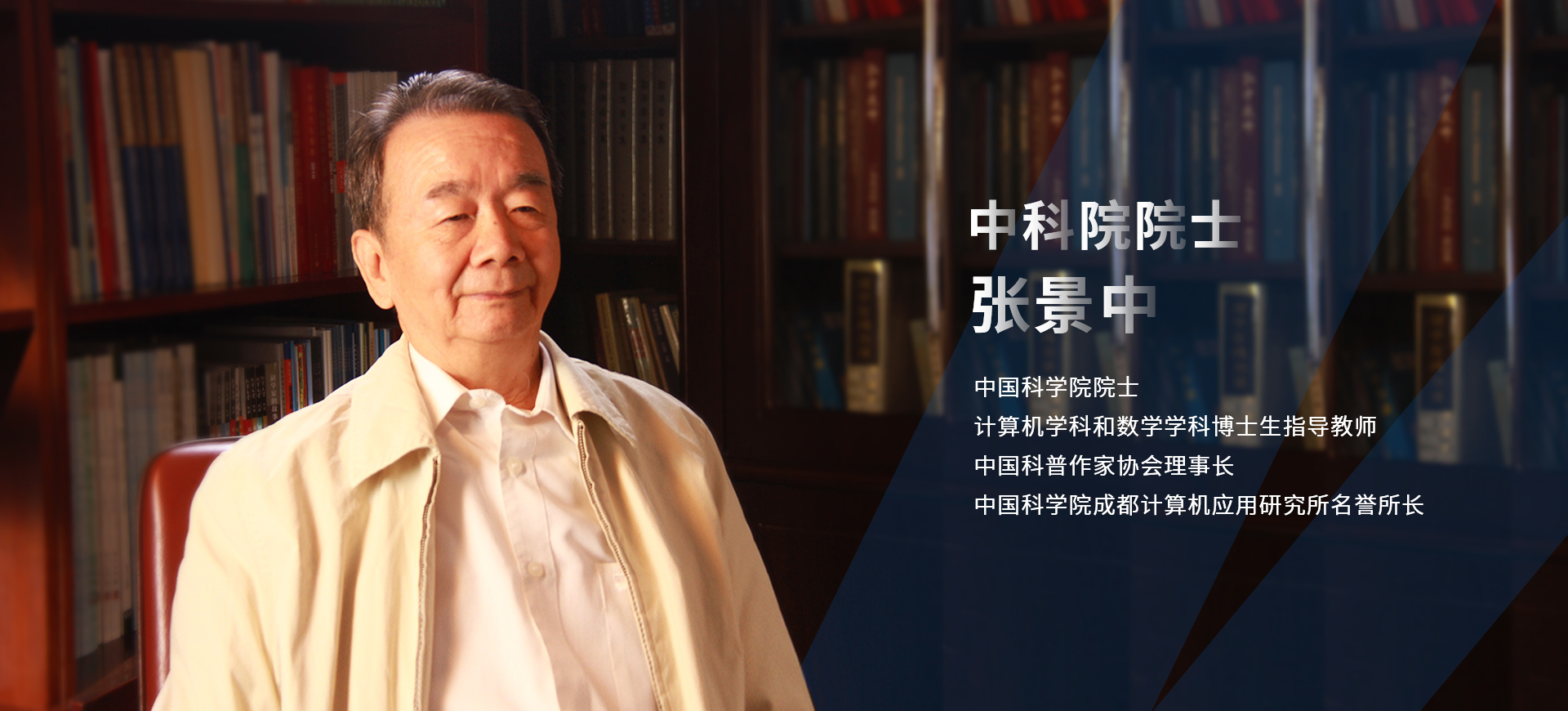 張景中,中國科學院院士,1959年畢業于北京大學數學力學系。從事計算機科學、數學和數學教育研究。《計算機應用》期刊主編。在機器證明、教育數學、距離幾何及動力系統等領域有貢獻。其成果1982年獲國家發明獎二等獎,1995年獲中科院自然科學獎一等獎和中國圖書獎,1997年獲國家自然科學獎二等獎,2003年獲全國科普創作獎一等獎、五個一工程獎和國家圖書獎,2005年和2009年兩次獲國家科技進步獎二等獎。他提出了三角、幾何、代數相互滲透的初等數學教學體系;提出了非ε語言的極限概念表述和實數理論的連續歸納法;發現了不用極限或無窮小建立微積分的基本理論和方法。
