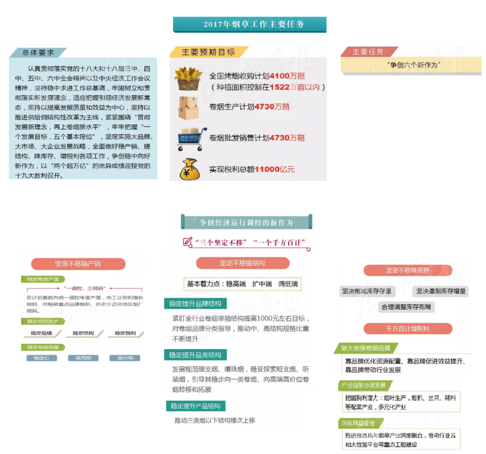 2017年全國煙草工作會議在北京召開,國家局局長凌成興在會上作了題為《堅持穩(wěn)中求進總基調 爭創(chuàng)穩(wěn)中向好新作為以“兩個超萬億”優(yōu)異成績迎接黨的十九大勝利召開》的報告。