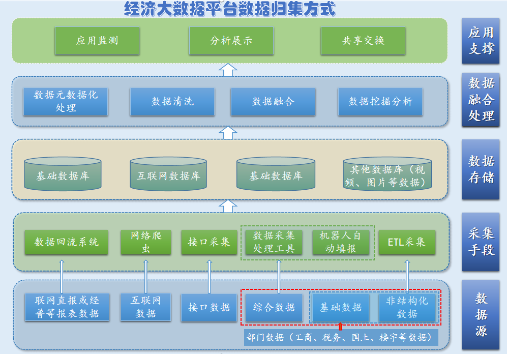 對歸集的數據進行梳理、清洗形成能夠支撐經濟運行分析、挖掘和應用的相關數據資源體系,并采用“集中管理、分布應用”的數據管理模式,建立數據融合模型按數據映射將各類數據進行融合,包括名錄數據融合、項目數據融合、專業數據融合、部門數據融合、互聯網數據融合