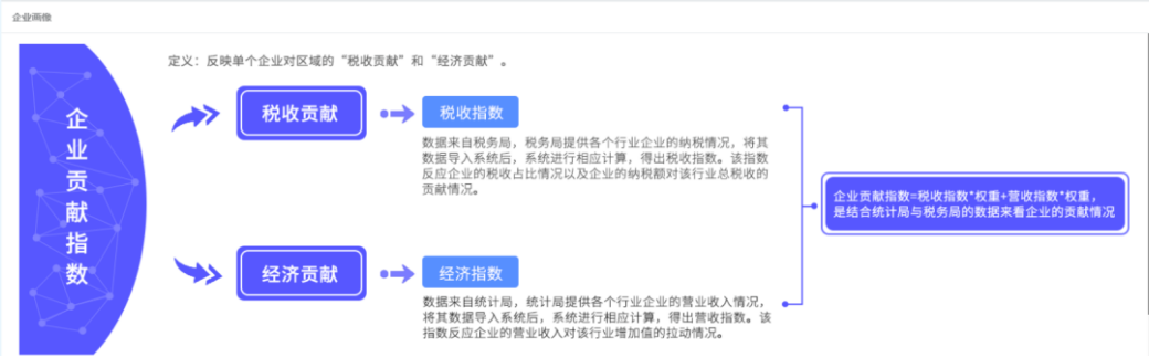 利用大數據匯聚、處理、分析挖掘、可視化展示等技術支撐,聚焦監測地區的經濟運行大局,為地方政府研判經濟運行態勢提供輔助支撐,不斷提升政府精細化決策能力。基于企業基礎指標數據,利用大數據技術深度挖掘,建立企業健康指數監測模型和企業貢獻指數監測模型,輔助經濟主管部門及領導,更加客觀、準確地判斷每個企業的健康發展與貢獻情況,從而科學預判企業的成長潛力,提高監管精準性和政府領導決策能力。