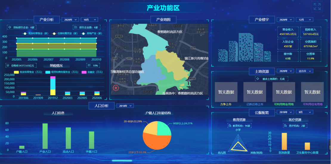 整合地區產業經濟數據和地理數據,利用可視化和地理信息技術對區域內的產業經濟和空間布局進行全新解讀,構建“產業經濟一張圖”,滿足地方政府、各級部門對城市經濟發展數據摸清、精準調度、精準發力,分析搞透、問題抓準、及時監管的要求。通過圖表結合的方式展示區域內整體招商情況,規劃設計、招商環境等信息,整合樓宇載體、土地資源、招商政策、招商動態等信息,并與移動端數據保持同步更新,提高招商便捷性的同時為部門或街道招商引資提供數據支撐,提高招商能力和水平,降低招商成本,促使地方經濟健康、快速發展。